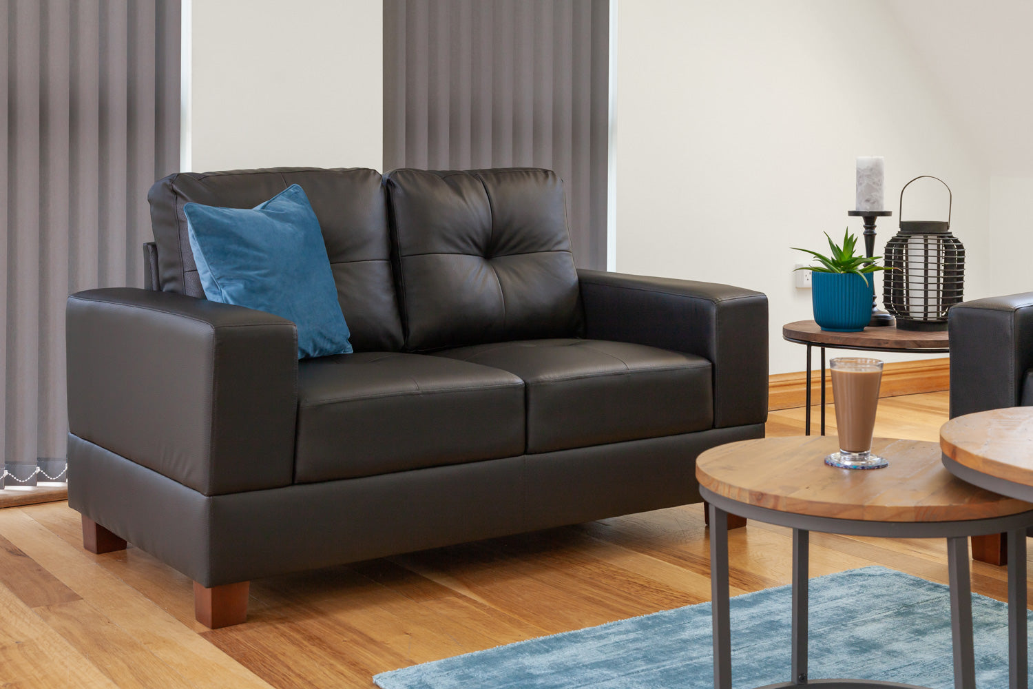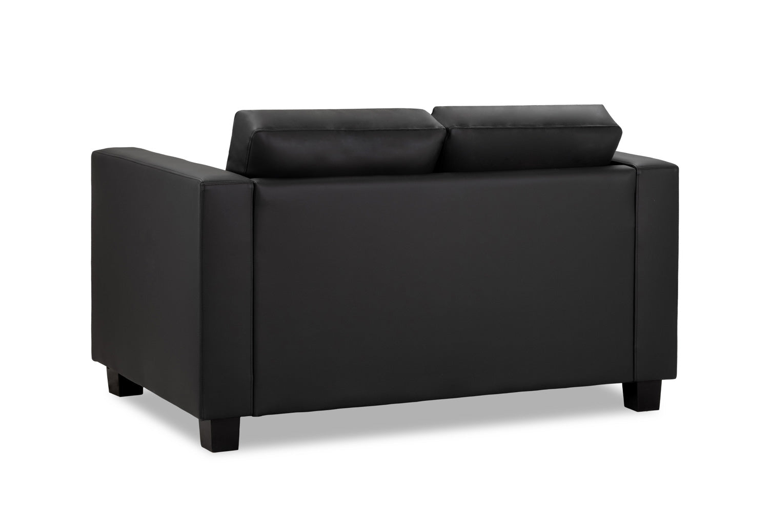 The Jerry 2 Seater in Black features an almost simplistic design, with a boxy shape contrasted with soft plump cushions. Smooth faux leather and chunky wooden feet make this sofa an excellent choice for any style of interior.