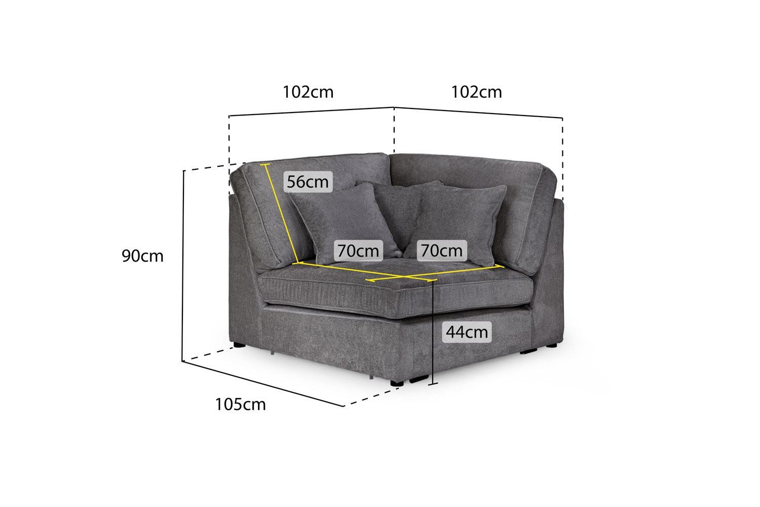 Introducing the Grey Kiana Modular Corner Sofa: cosy, comfy and crafted to last. Module: Grey, Corner The Kiana’s modular sofa structure offers absolute design freedom. Fancy changing things up a bit? Manoeuvre the layout of the modules to craft the perfect sofa for your lifestyle, allowing you to recreate your space at a whim and without hassle. Durability doesn’t have to mean compromise on comfort, especially not with the Kiana. Soft-touch chenille upholstery presents the best of both worlds; the tightly woven yarn is strong enough to withstand the trials and tribulations of day-to-day life- but still retains a soft, cloud-like disposition to relax on. The Kiana comes adorned with cosy cushions. Non-slip panels back the Kiana’s (removable) cushions covers to keep your sofa looking immaculate, while extra comfort cushions are scattered across each module - absolute bliss.